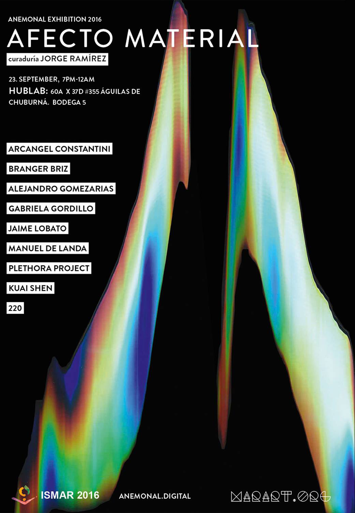 AFECTO MATERIAL is part of ANEMONAL, a media art multi-platform that links, promotes and explores hybrid projects of science, art and technology. The activities mix live acts, art exhibitions, workshops and conferences. ANEMONAL is directed by artist Jorge Ramirez.