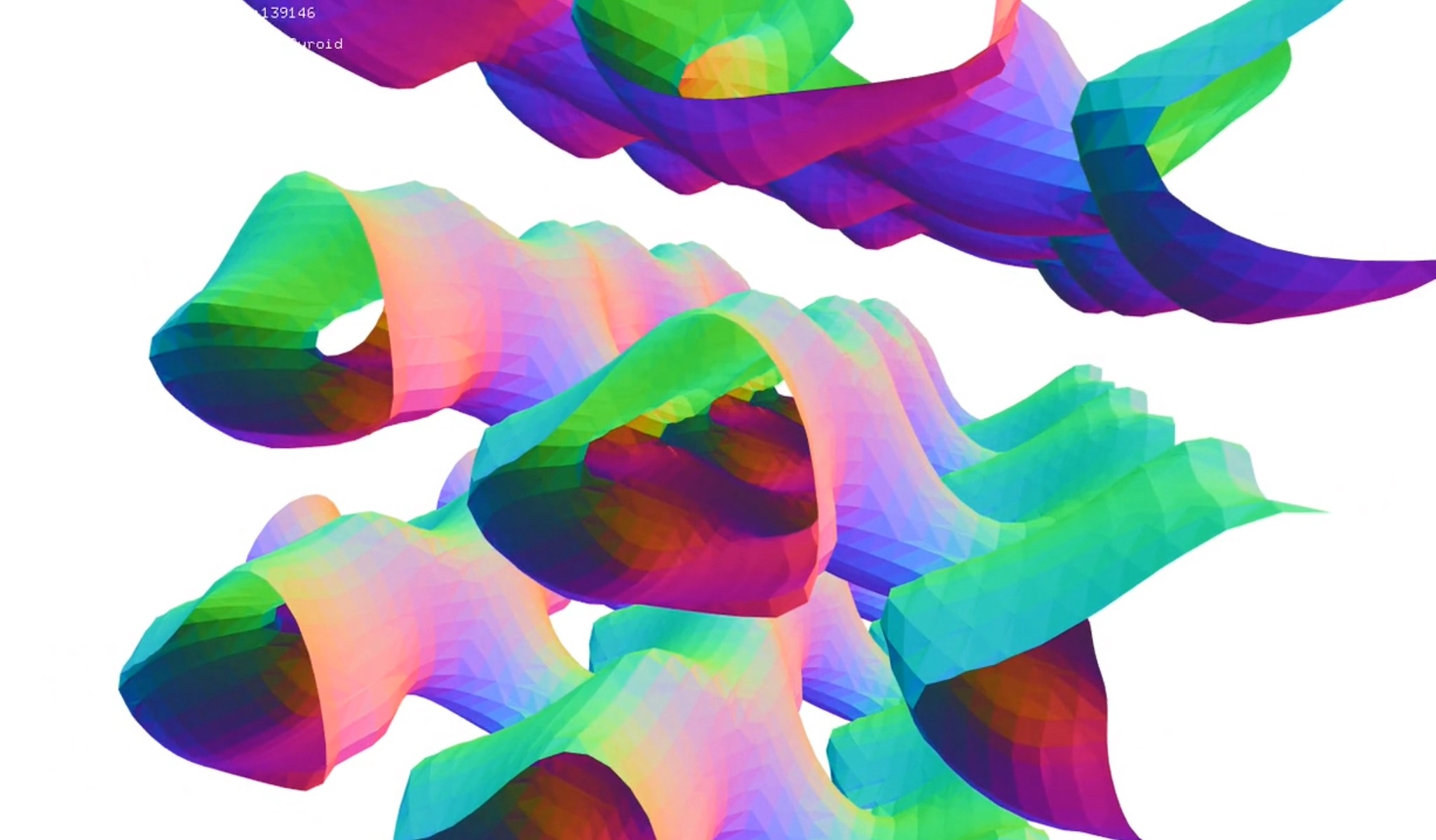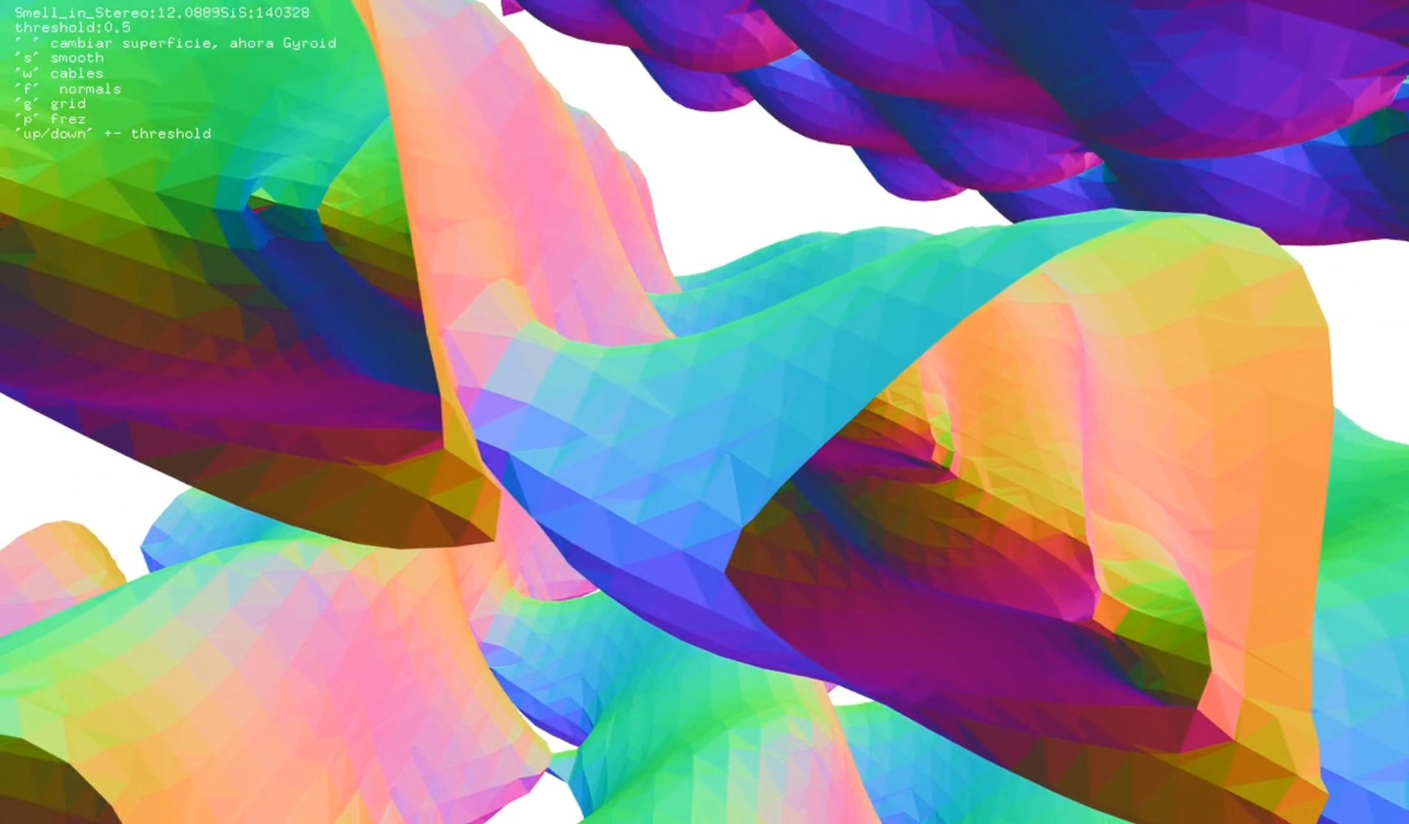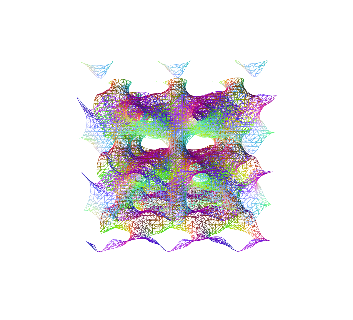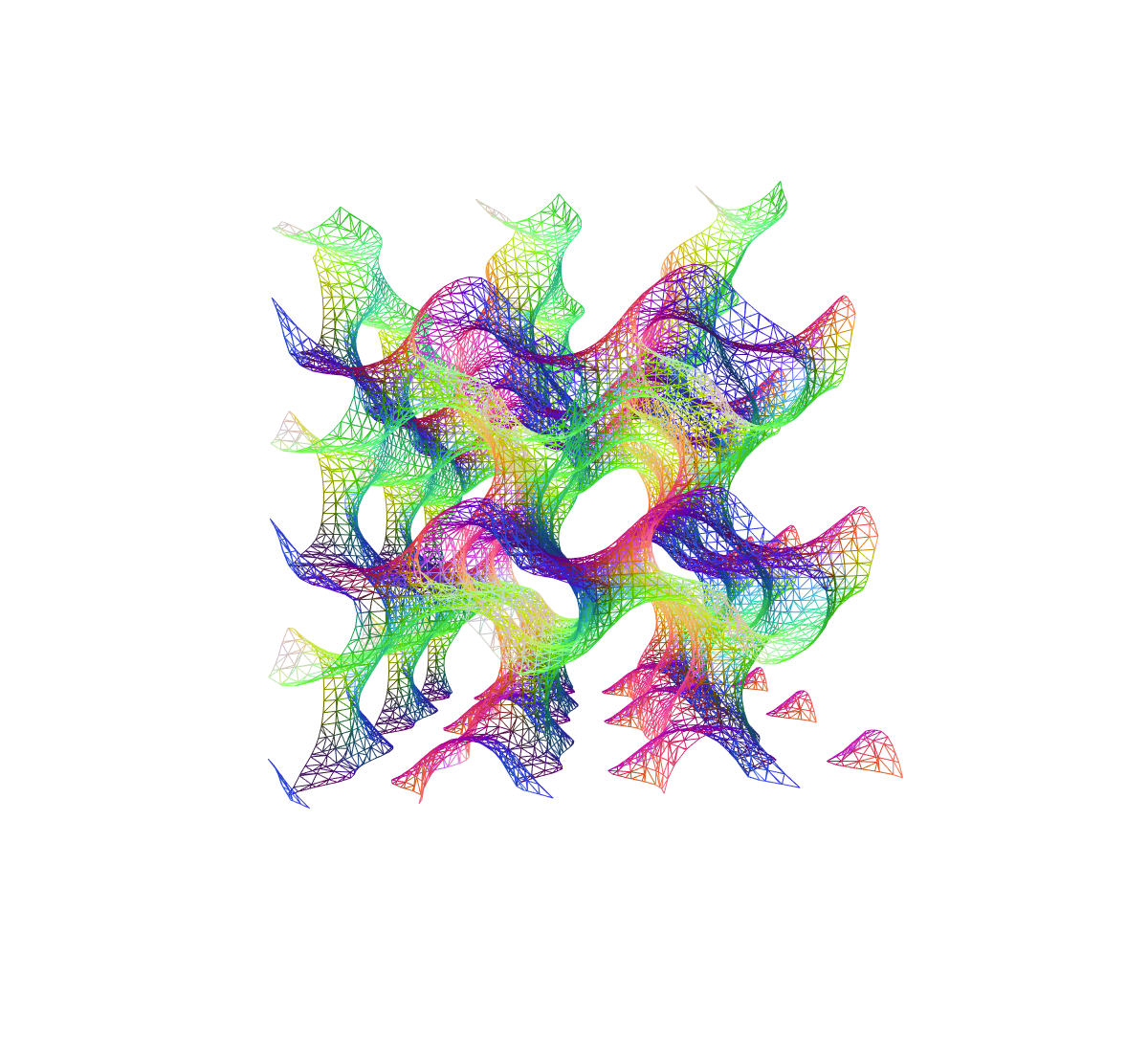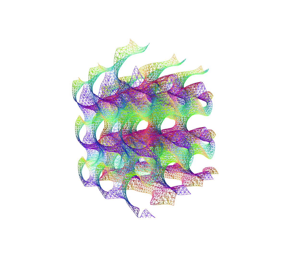 La geometría de un “Gyroide” (descubierto por Alan Schoen en 1970), es una superficie que no contiene planos ni lineas rectas, por lo tanto dificilmente construible por medio de planos o dibujos, sin embargo, el Gyroide puede ser expresado trigonometricamente como: