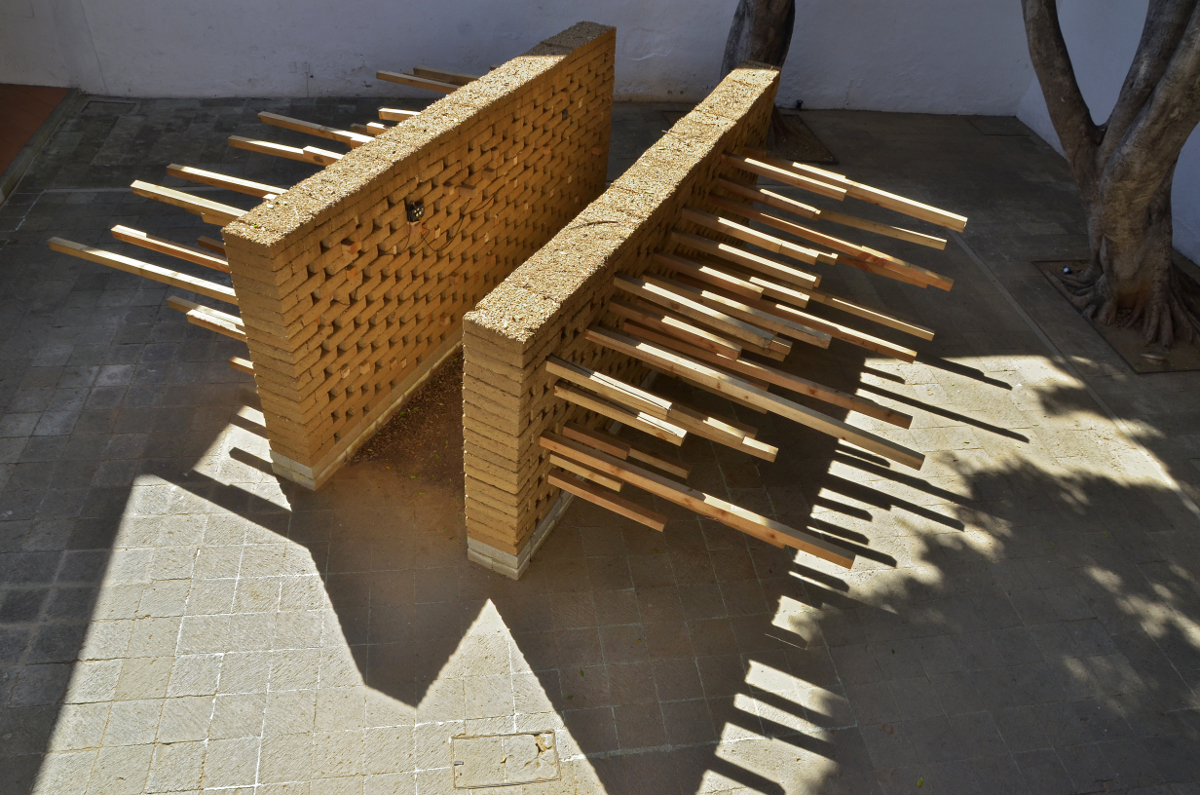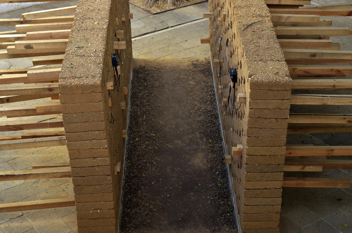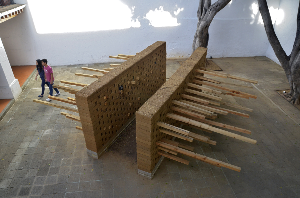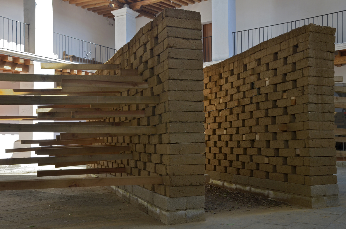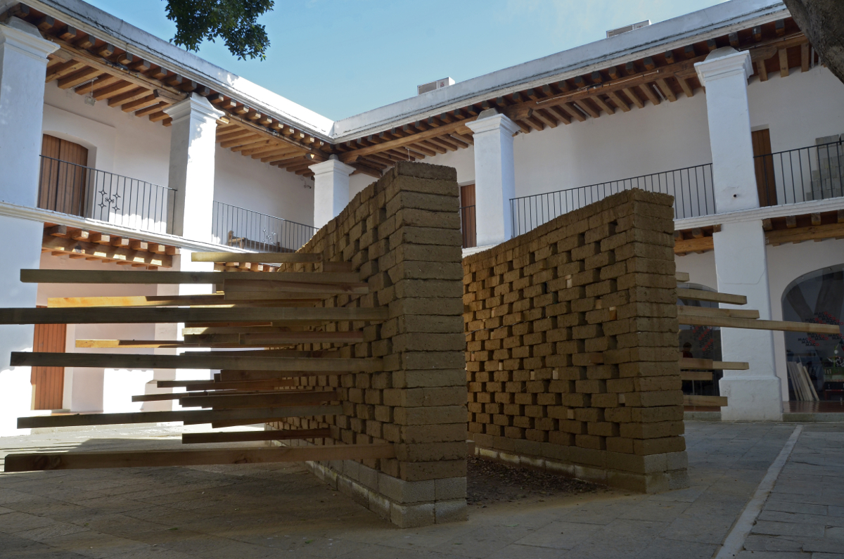 This is a Pavilion of primal materials and sound, divides a courtyard by means of two adobe walls creating a route and modifying the acoustic properties of the place.