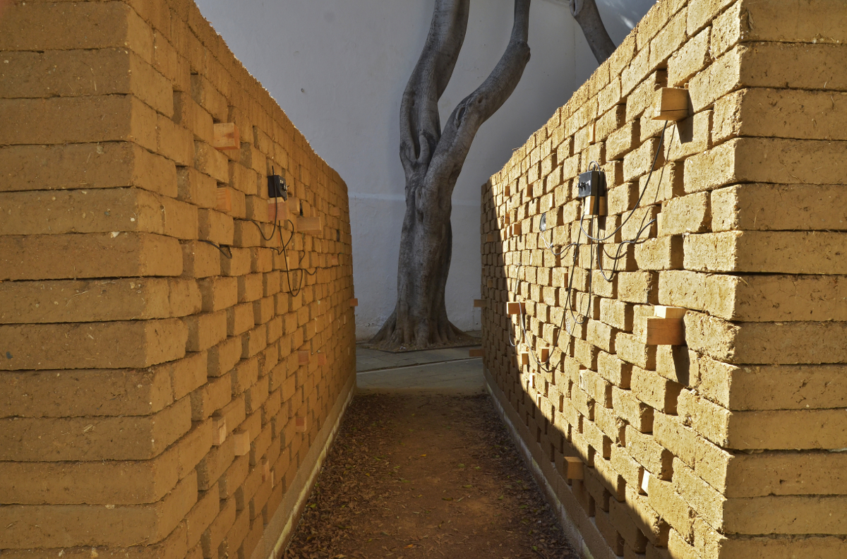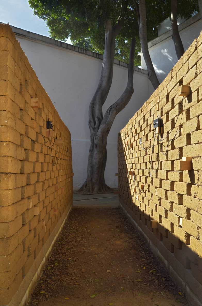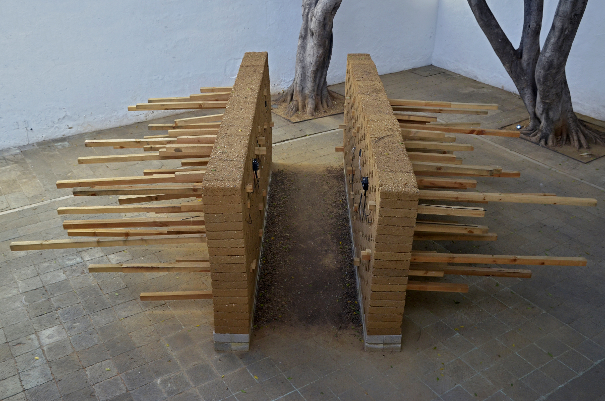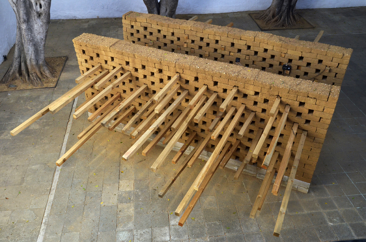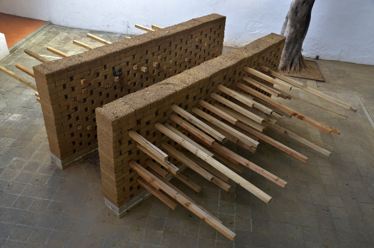 This is a Pavilion of primal materials and sound, divides a courtyard by means of two adobe walls creating a route and modifying the acoustic properties of the place.