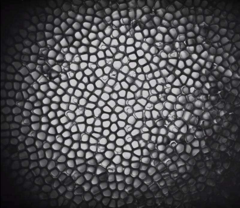 The series of experiments on transparent model alloy succinonitrile – 0.24 wt% camphor, under low gravity in the DECLIC Directional Solidification Insert on-board the International Space Station (ISS), bring this type of emergent properties by evolution of the solid-liquid interface in outer space material logic. It offers the very unique opportunity to observe in situ and characterize all stages of microstructure formation in extended three-dimensional geometries. The original images were brought back from the ISS captured by 1024 x 1024 pixel images captured every 2.7 seconds. Providing us with an animated evolutionary cell patterns visualization.