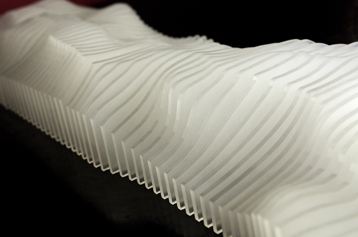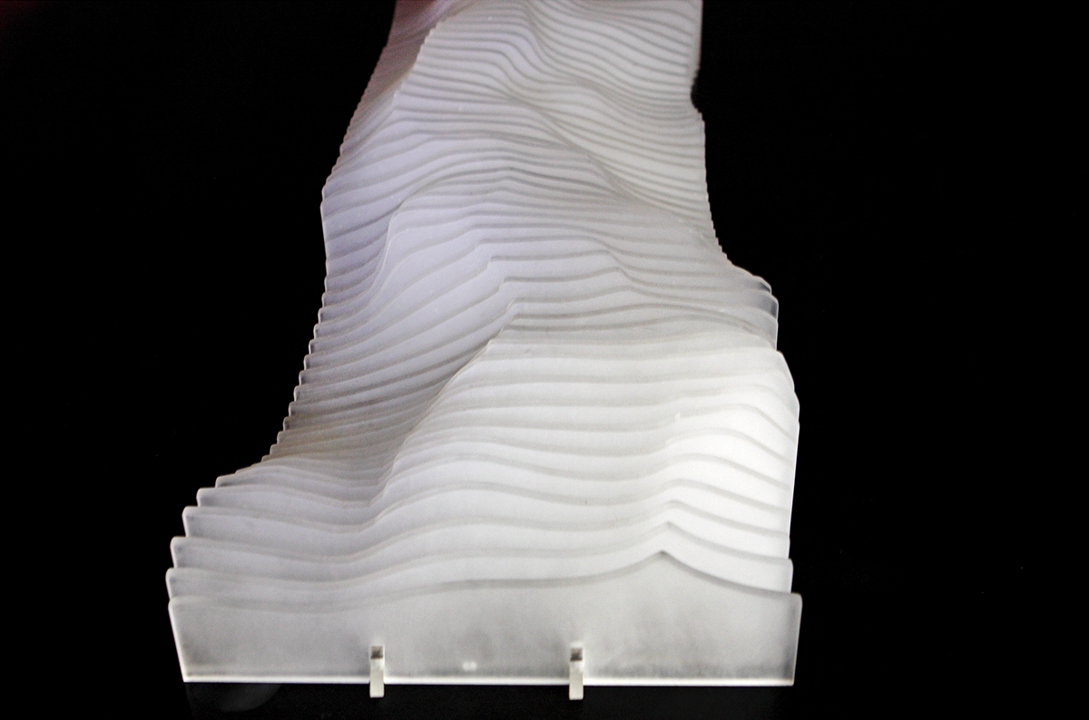 Morphogenesis through sound analysis: materialization of an invisible ethereal phenomena for form finding procesess. Through the analysis of a soundwave, we extract a piece in time of the development of audio frequencies and make it visible in material (plexiglass). Making a sculpture of freezed sound.